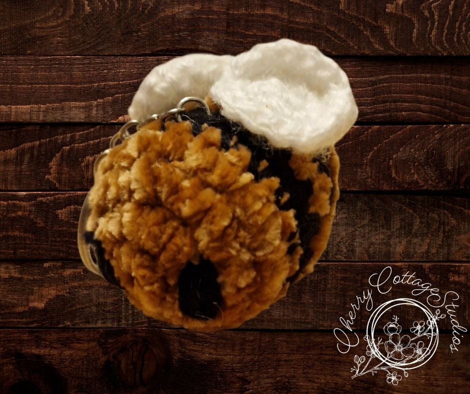 - Crochet charm: Handmade with love in brown, black, and white yarn